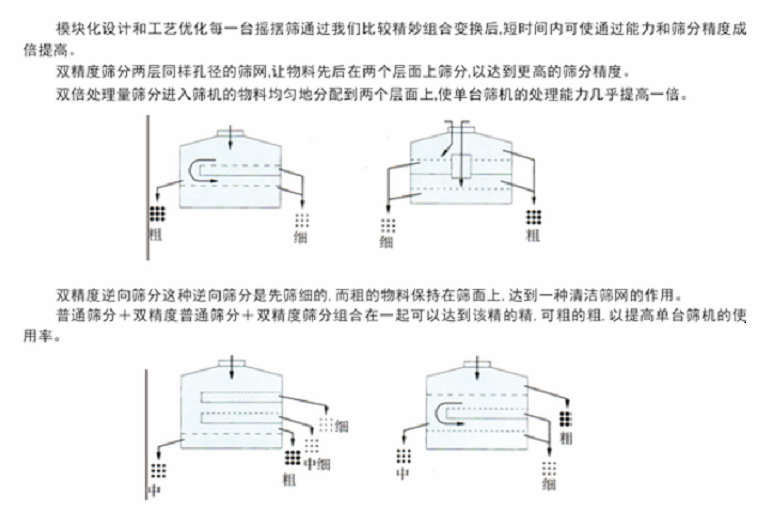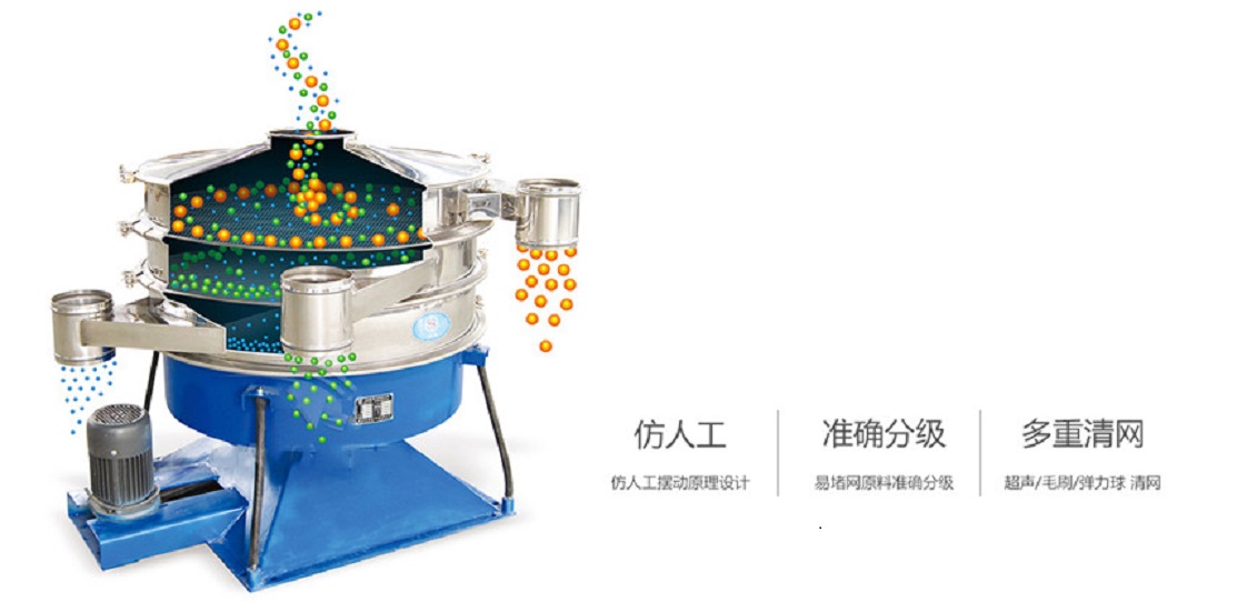 搖擺篩它采用仿生人工篩分的原理,將手工篩分動作的“篩”-(平面圓周運(yùn)動)和“簸”-(向上拋物料)這兩種運(yùn)動形式好的結(jié)合在一起,解決精細(xì)與超精細(xì)范圍的粉末與顆粒物料的篩分難題。