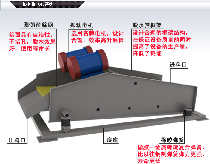 1、篩機整體采用水平安裝,篩網(wǎng)傾斜安裝,可以保證強制脫水;