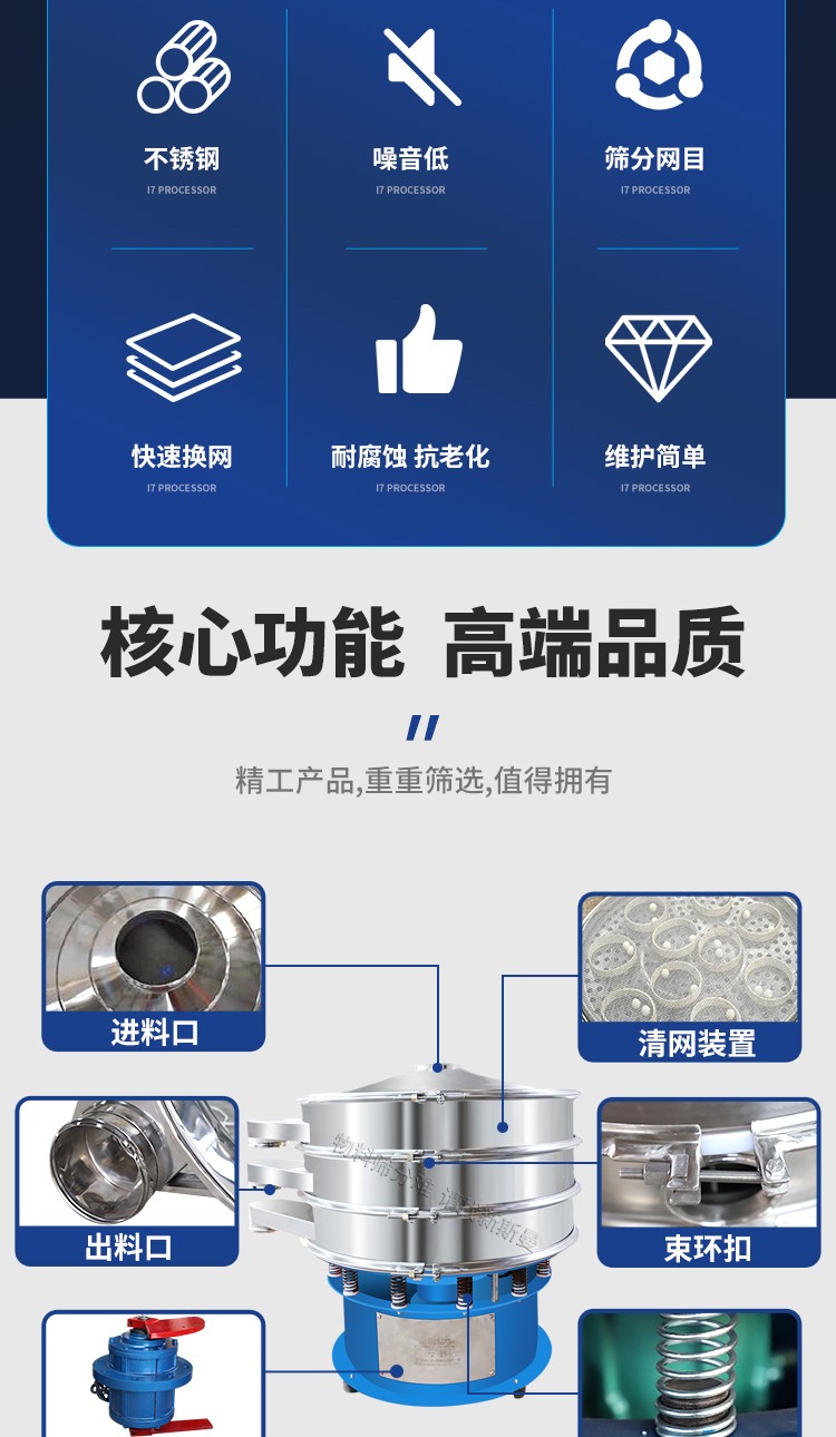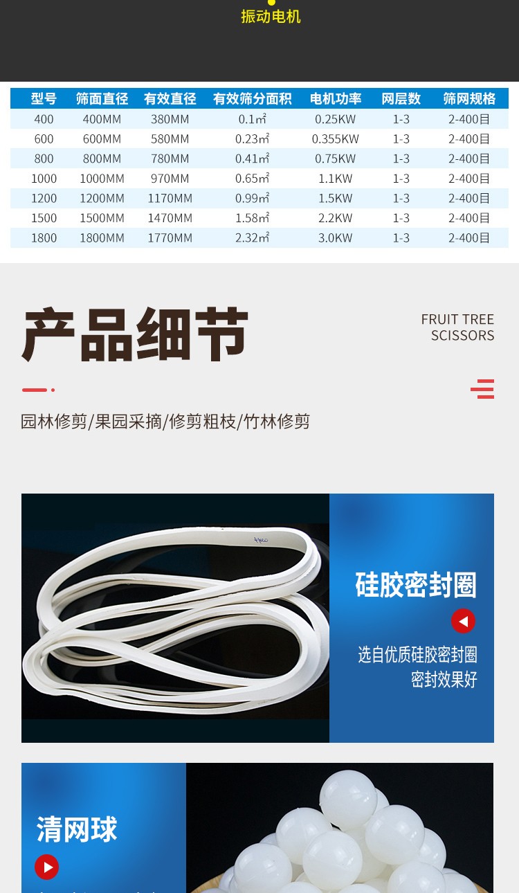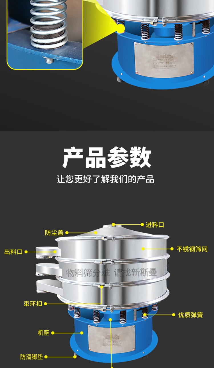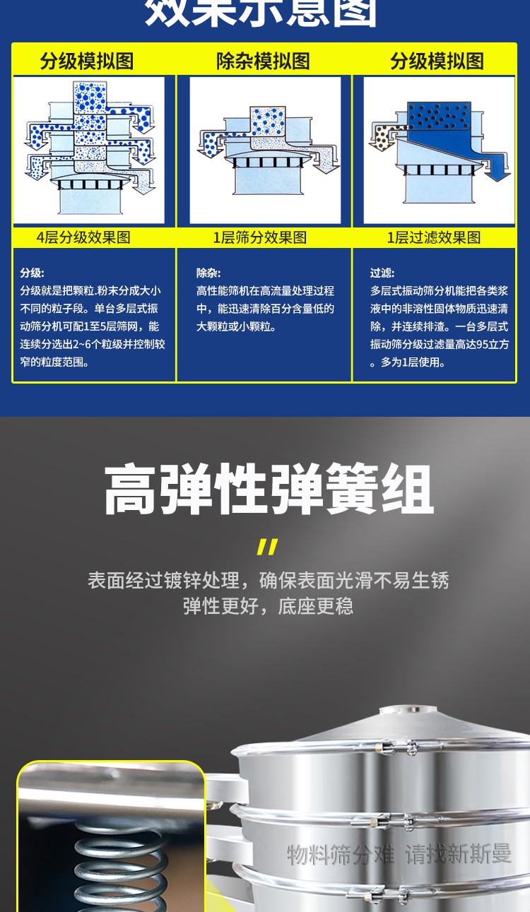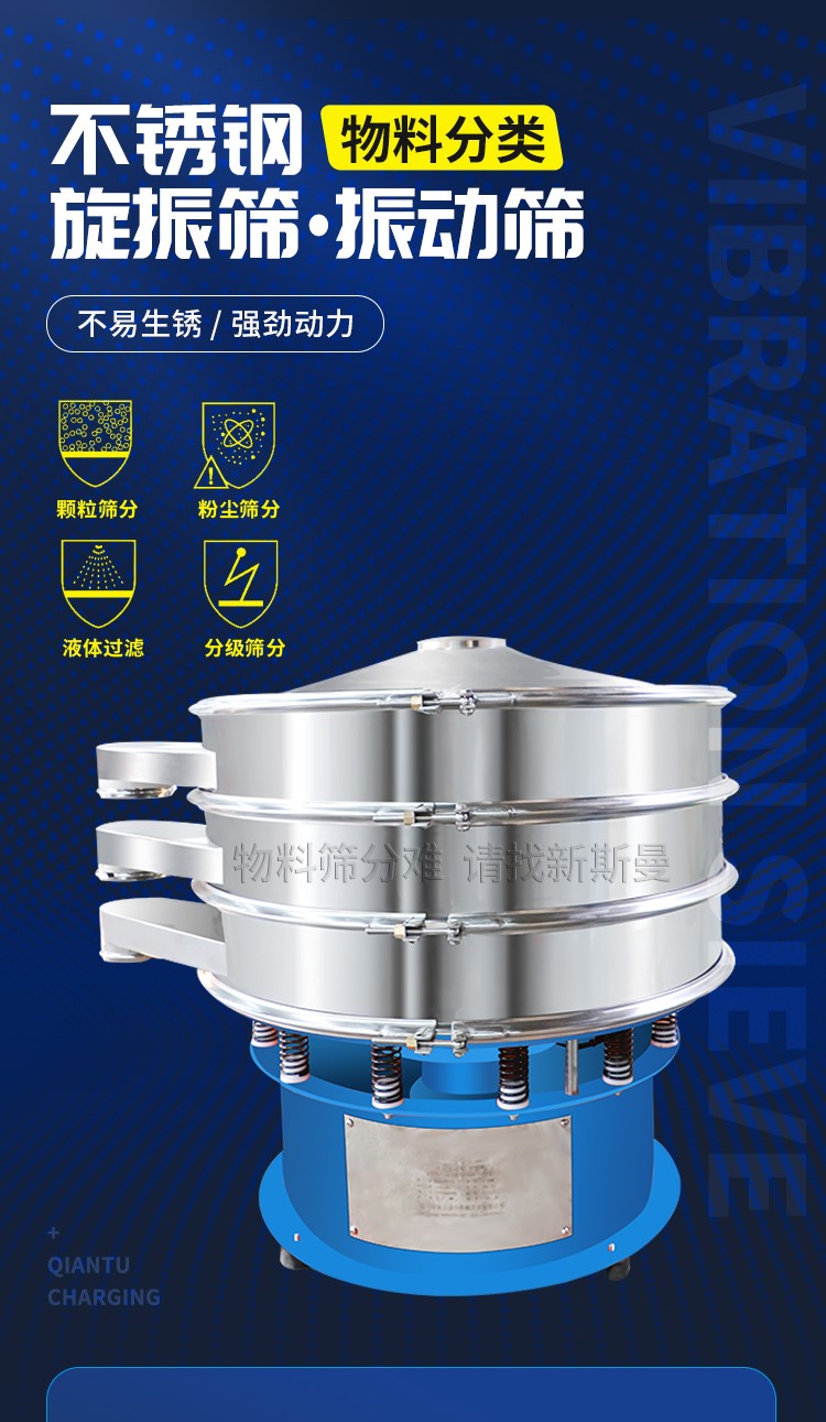篩選范圍廣--只有系列三次元旋振篩能分選如此廣的原料范圍:任何顆粒、細(xì)粉、漿液都可以篩選。篩分細(xì)500目(28微米),過(guò)濾細(xì)5微米。網(wǎng)孔防堵塞--三次元振動(dòng)功能及自動(dòng)清理堵網(wǎng)裝置把堵網(wǎng)幾率降到小。 單層或多層分選--每臺(tái)旋振篩可選一至五層篩網(wǎng),能同時(shí)進(jìn)行二到六個(gè)等級(jí)的分選或過(guò)濾。