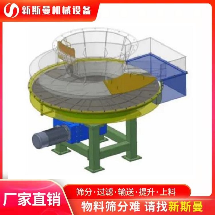 工作時,電動機通過減速機帶動圓盤轉動。圓盤轉動時,料倉內的物料隨著圓盤一起移動,并向出料口的一方移動,經閘門或刮刀排出物料。排出量的大小可用刮刀裝置或閘門來調節(jié)。圓盤給料機適用于20mm以下粉礦的給料設備,尤其針對河沙、石英砂、機制砂等砂類、顆粒類物料佳。