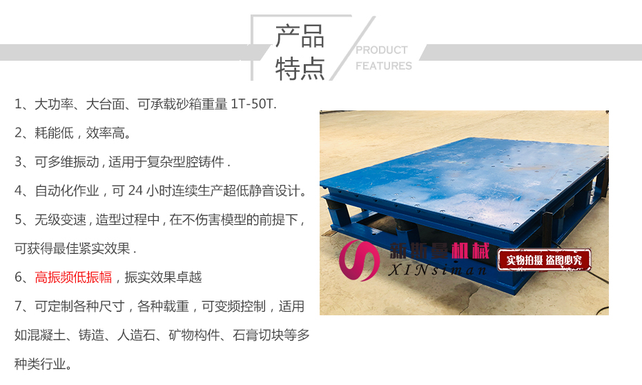 ◆大功率、大臺(tái)面;功率可大7.5kw,激振力80KN,可承載10T。