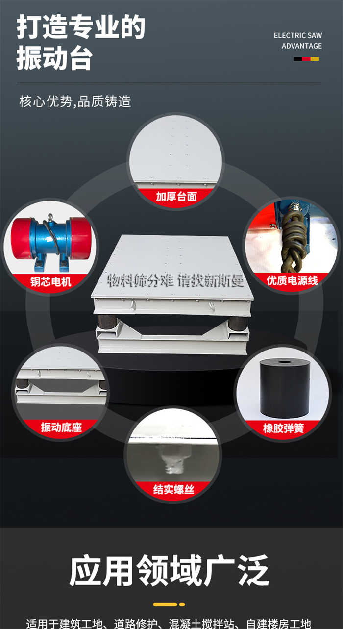 被廣泛應用于試驗室、現場工地作試件成型和預制構件震實各種板柱、梁等混凝土構件振實成型,并應用在冶金、模具、食物、化工、建材等行業(yè)。