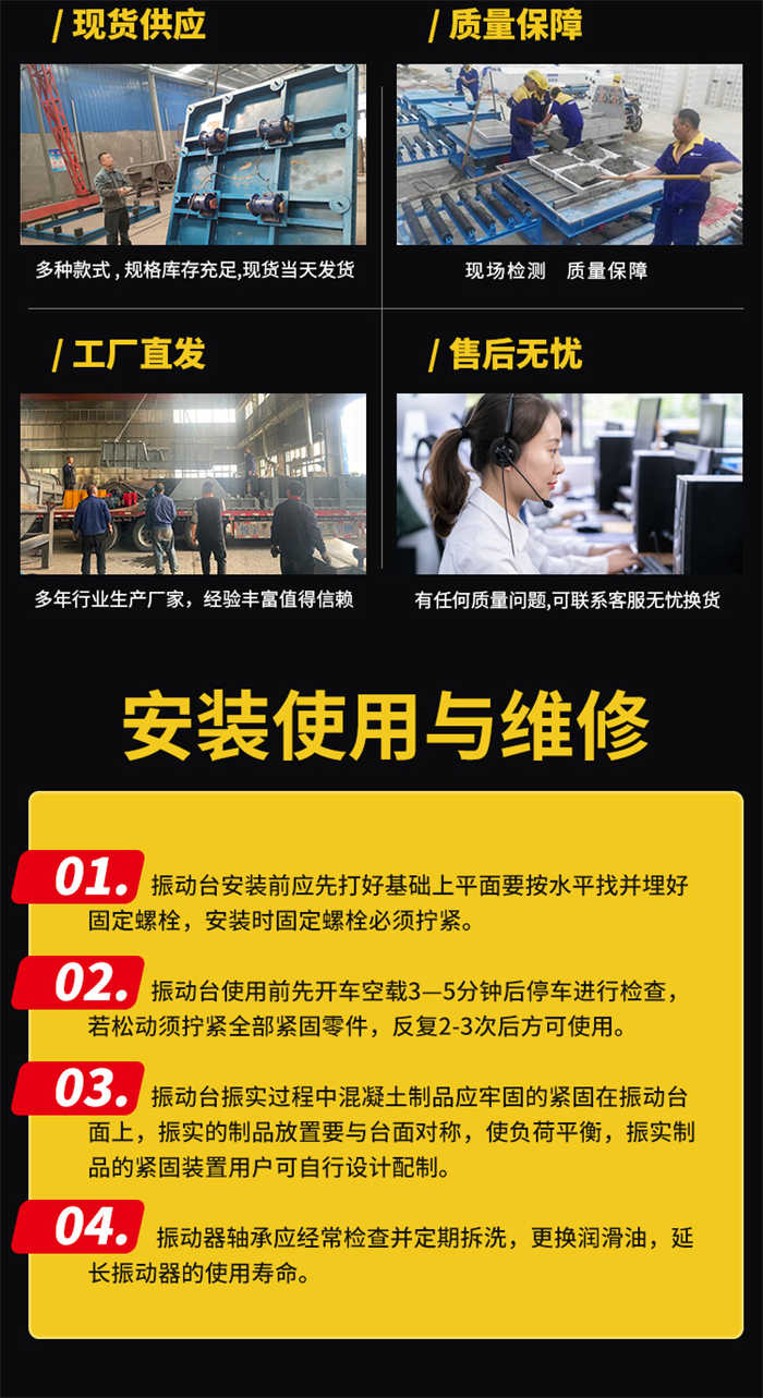 3、 振動臺在振實過程中,混凝土制品應牢固的緊固在振動臺面上,所需振實的制品放置要與臺面對稱,使負荷平衡,振實制品的緊固裝置。用戶可根據自己的需求自行設計配制。
