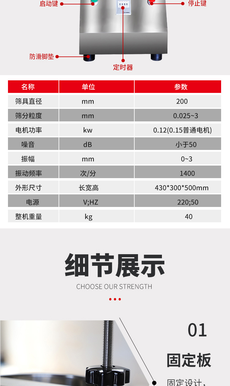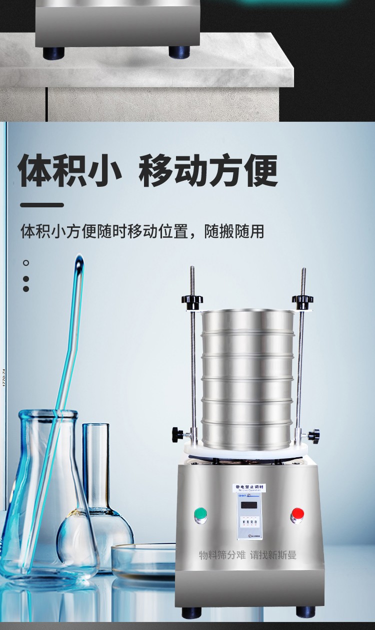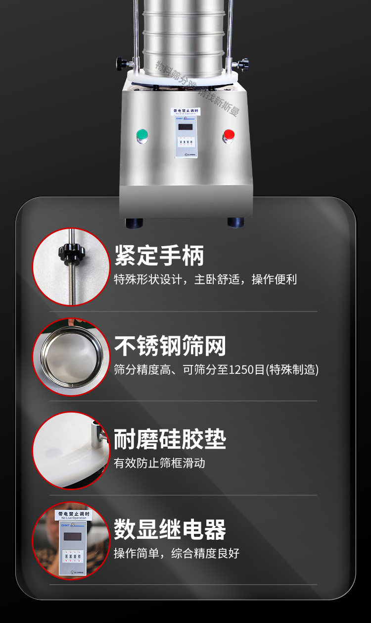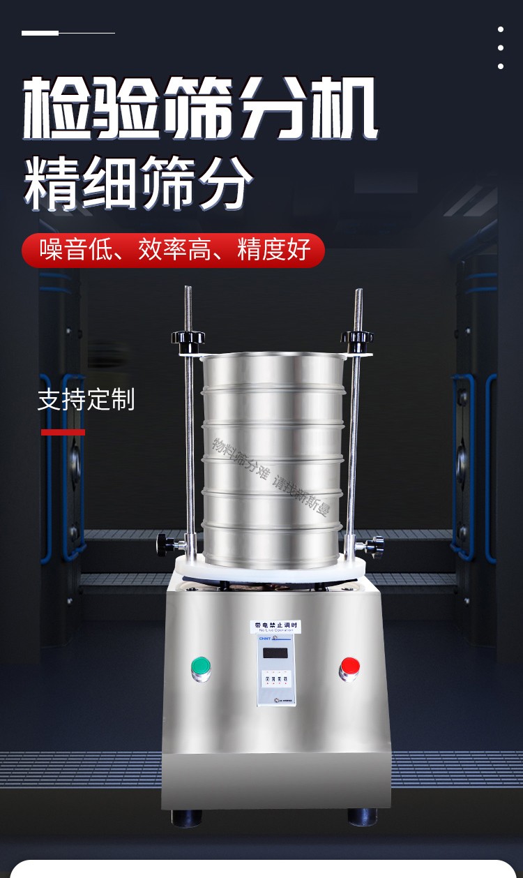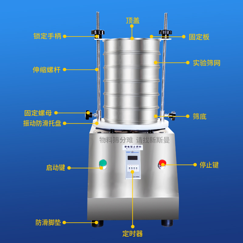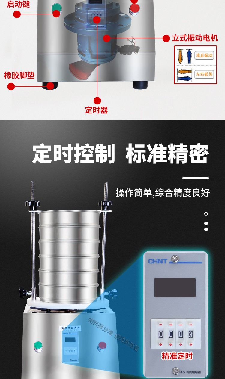 5. 根據(jù)物料性質(zhì)及投料量,在定時器上設(shè)定運行時間,然后打開電源開關(guān),標準試驗篩即開始工作。
