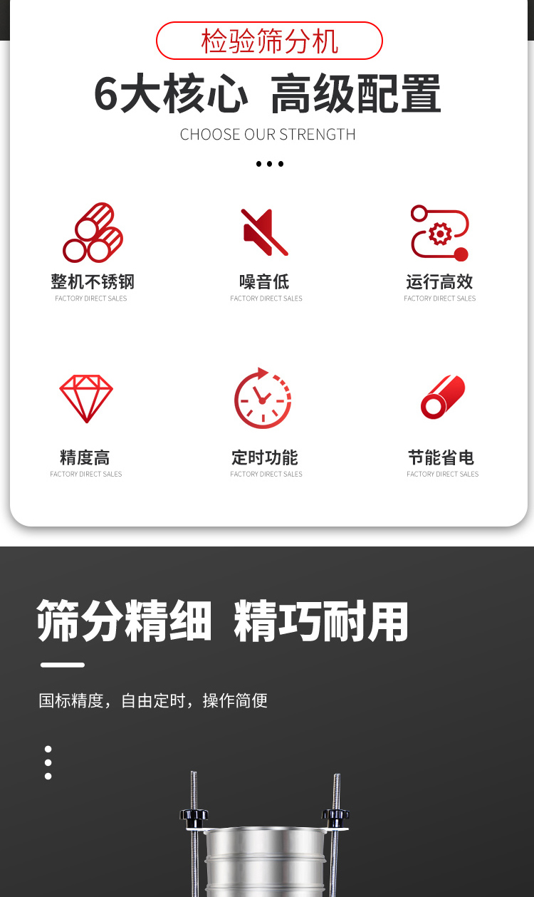 “機械篩分”將篩子按孔徑大小疊在一起,給料放在頂上一層篩子上,并加上蓋和底盤,一般疊5~6個篩子。然后放在機械振篩器上進行機械振動篩分。通常,振動時間為20分鐘。檢測篩分質(zhì)量時,再用振篩器振篩器振篩5分鐘,如每分鐘篩下量小于0.2%試驗樣量即為合格,對于粗粒物料,過篩率小于1%即可。如篩分過程中損失量超過總篩分量的0.5%時,試驗必須重新取樣進行。為避免損失和延長篩分時間,有時在開始篩分時先用細的篩子將粉塵篩除。