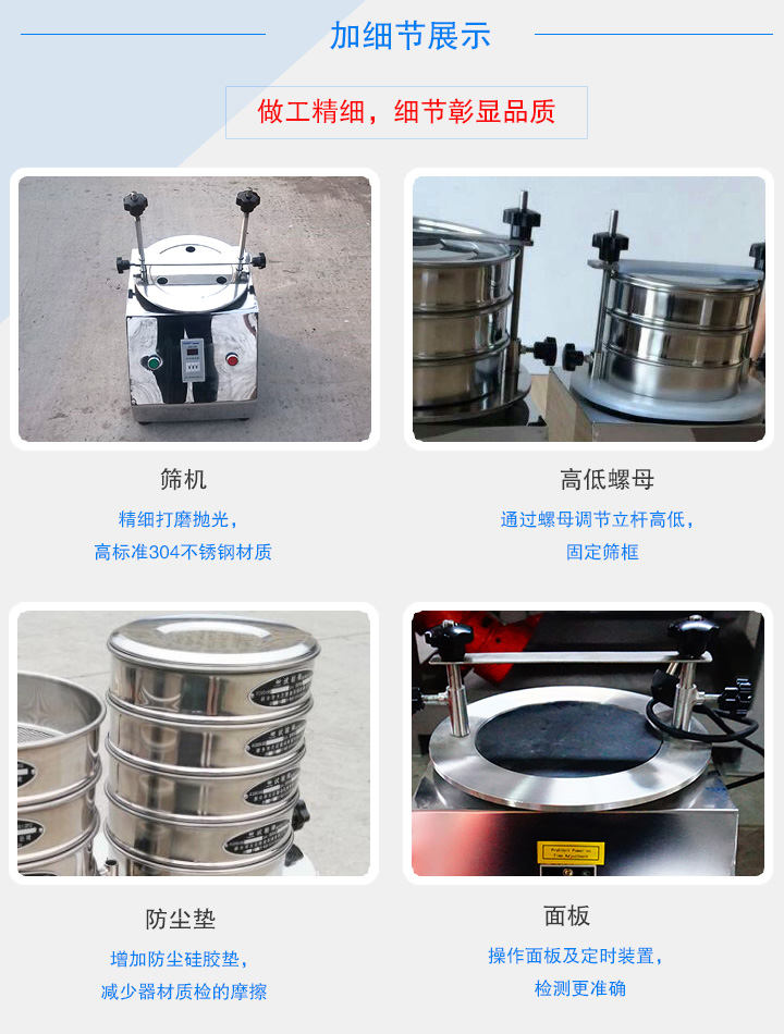 規(guī)格:Φ200*50和Φ200*25,篩框、篩蓋、篩底選用優(yōu)質(zhì)不銹鋼拉伸拋光而成。