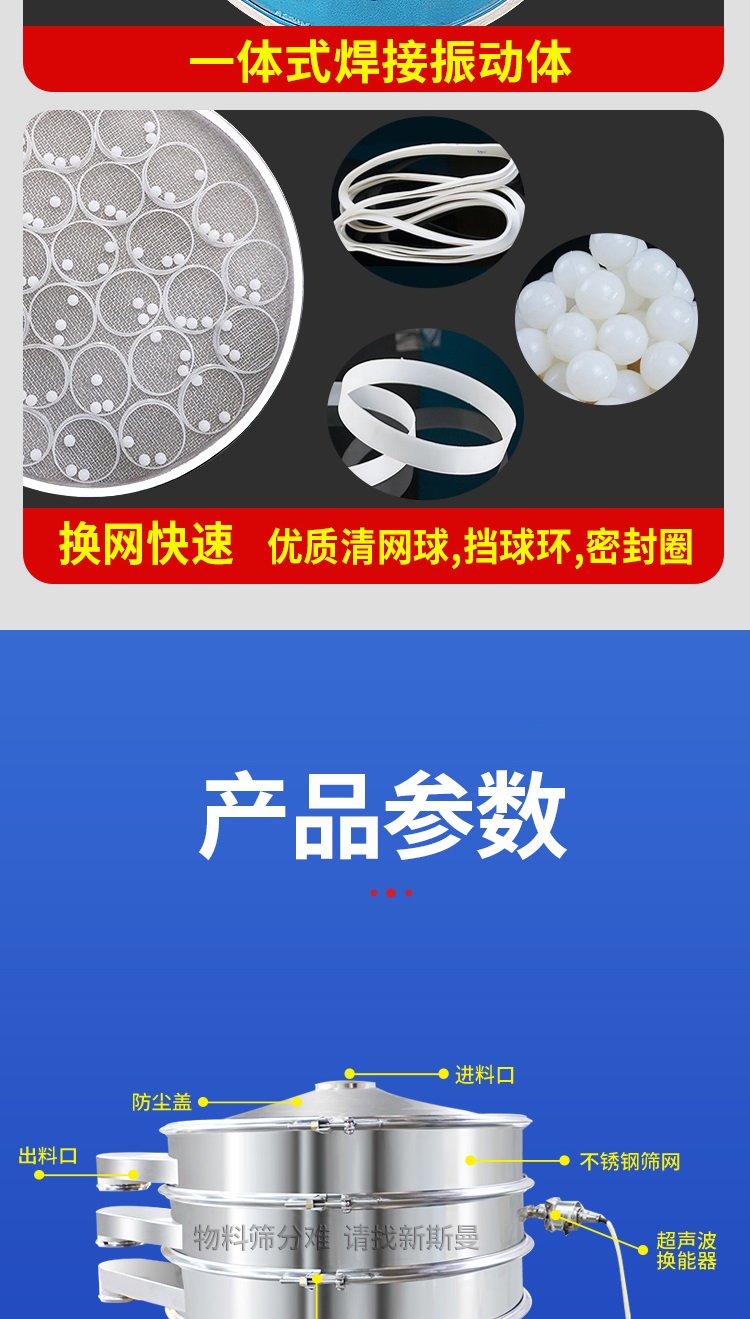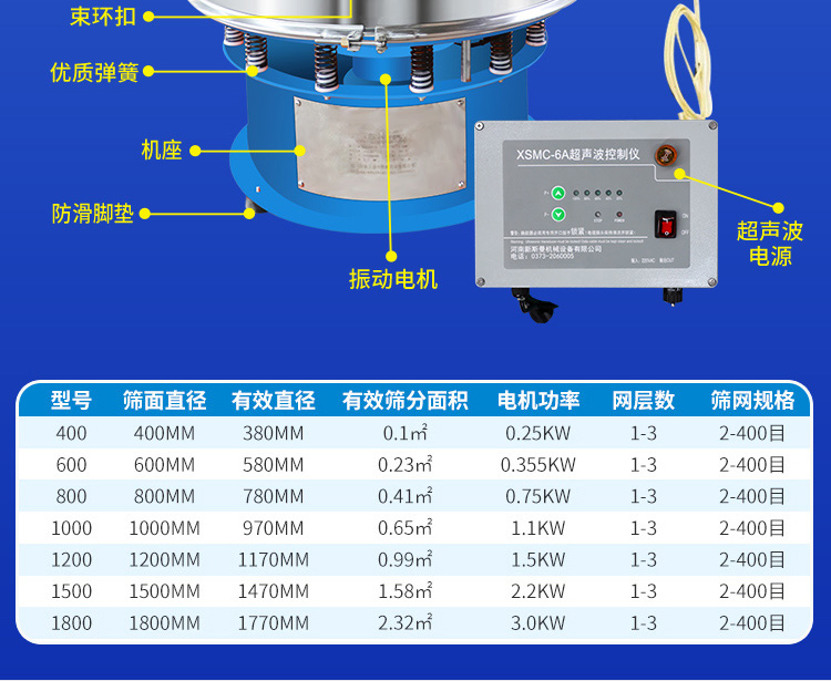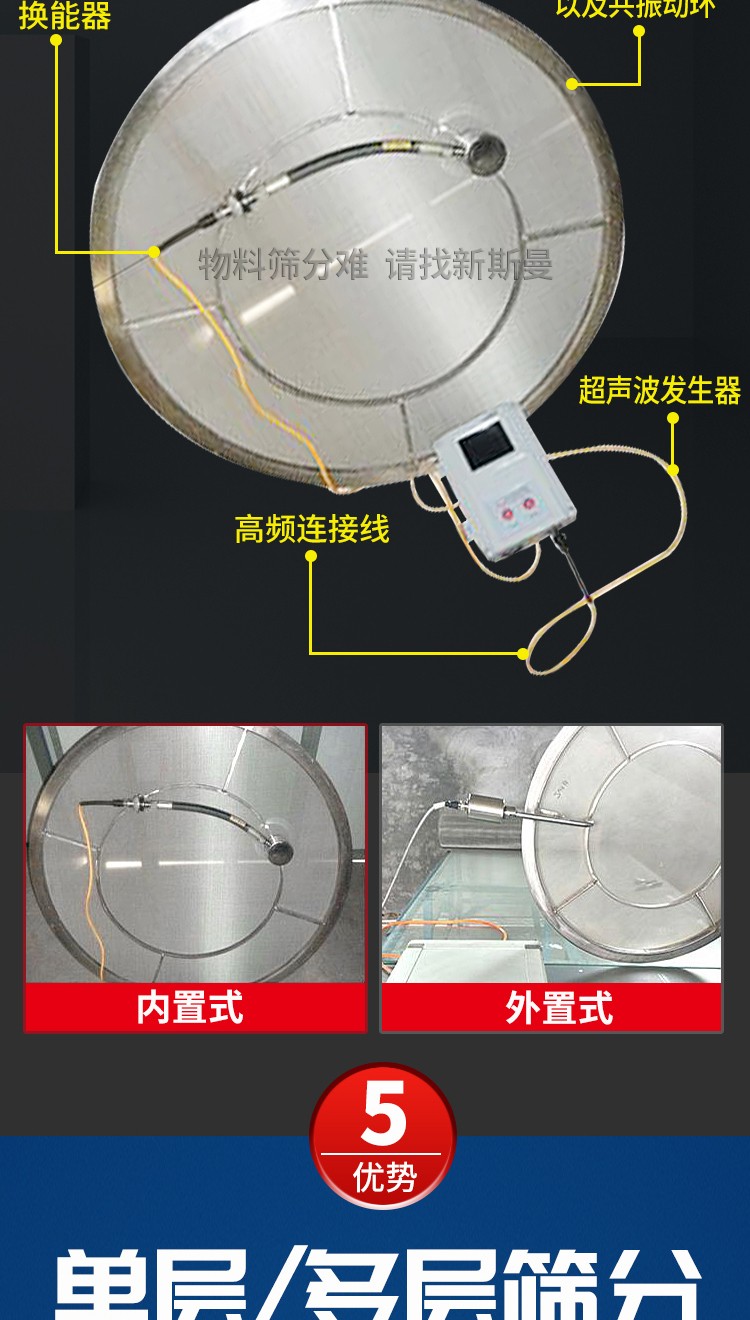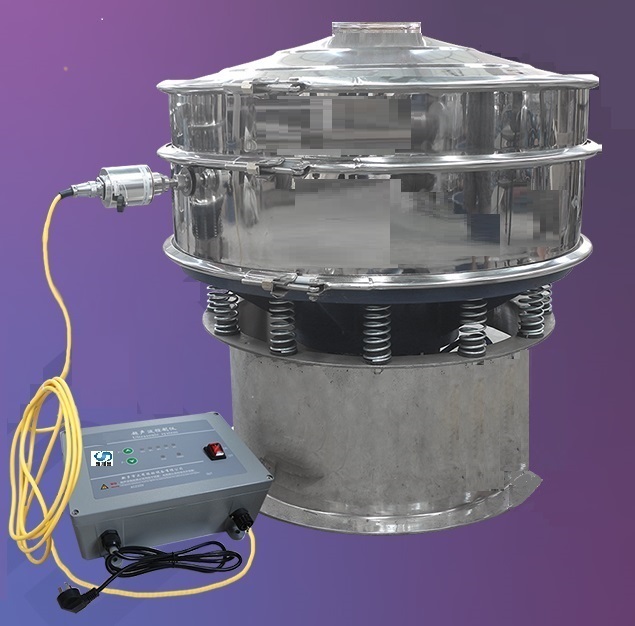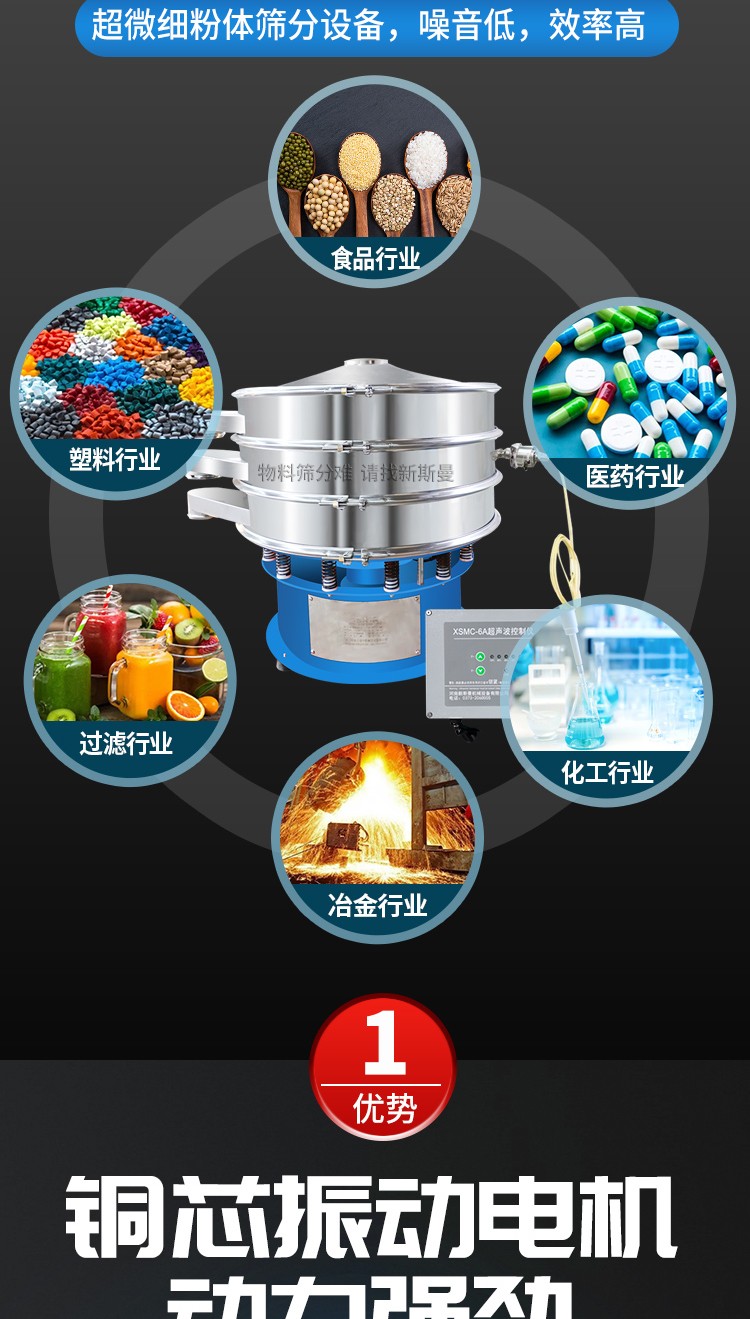 超聲波振動篩是在旋振篩的基礎(chǔ)上引入了超聲波清網(wǎng)裝置,通過將220V、50Hz或110V、60Hz電能轉(zhuǎn)化為18KHz的高頻電能,輸入超聲換能器,將其變成18KHz機械振動,從而達到高效篩分和迅速清網(wǎng)的目的,使超微細(xì)粉篩分成為易事。該系統(tǒng)在傳統(tǒng)的振動篩基礎(chǔ)上在篩網(wǎng)上引入一個低振幅、高頻率的超聲振動波(機械波),以改善超微細(xì)粉體的篩分性能。特別適合高附加值精細(xì)粉體的用戶使用。超聲波篩分系統(tǒng)是一種簡單實用、可靠的篩分系統(tǒng),是當(dāng)前網(wǎng)孔堵塞的有效的解決方法??蓮V泛應(yīng)用于制藥、冶金、化工、選礦、食品等要求精細(xì)篩分過濾的行業(yè),篩分過濾精度高,有效解決因團聚、靜電、強吸附性卡堵網(wǎng)孔等篩分難題,是國內(nèi)篩分行業(yè)的一項重大技術(shù)突破。