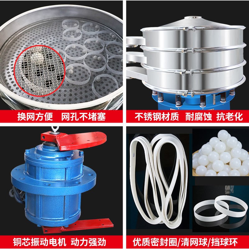任何顆粒、粉末、粘液一定范圍內(nèi)均可篩選。篩分細至500目或0.028mm, 過濾小可至5微米。分級篩選,可篩一至五層篩網(wǎng),能同時進行二至六個等級的分選或過濾。