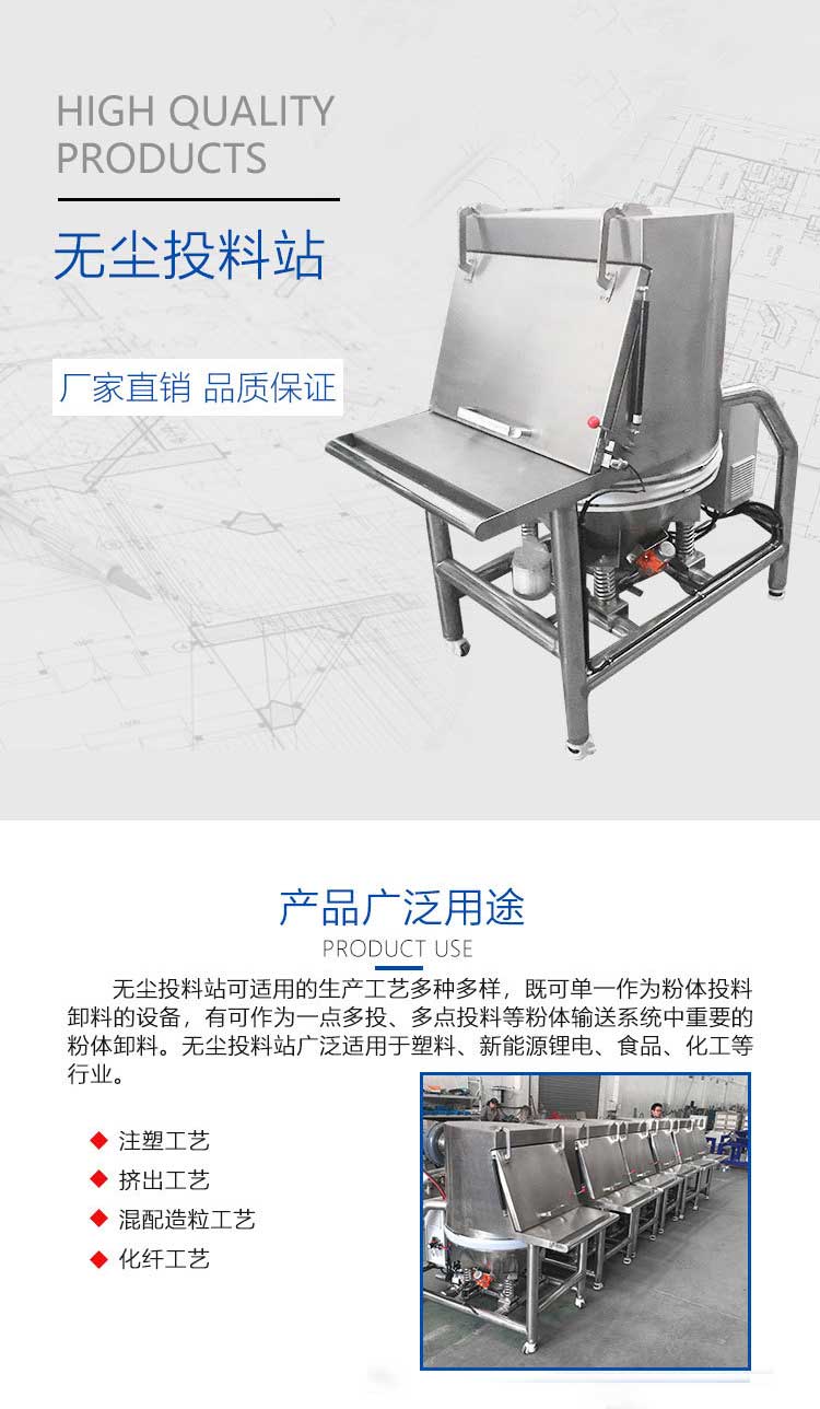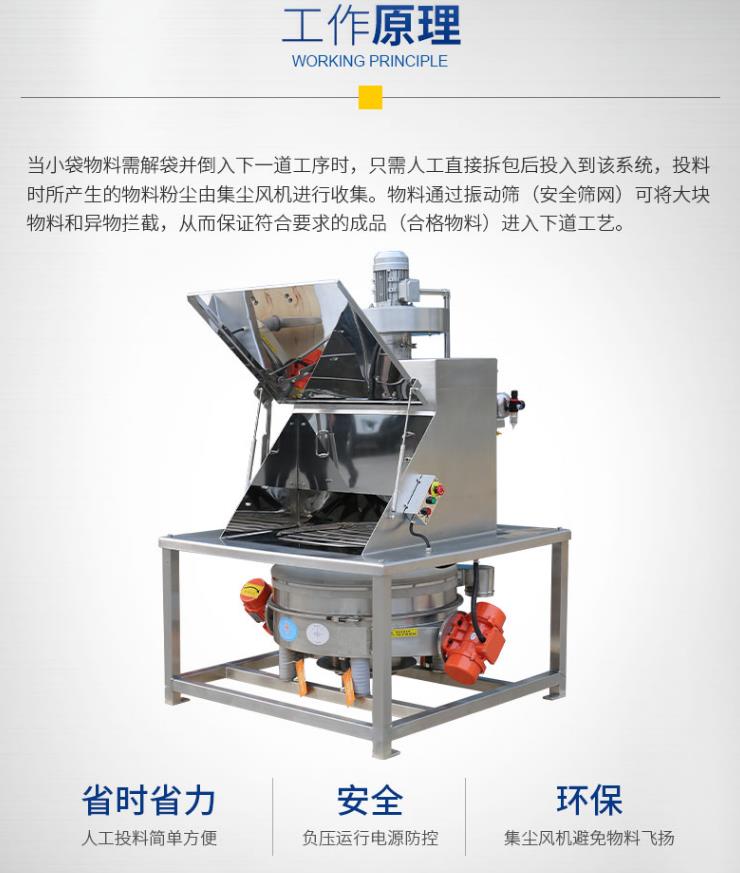 拆包時由于集塵風(fēng)機(jī)的作用,可以避免物料粉塵到處飛揚(yáng)。
