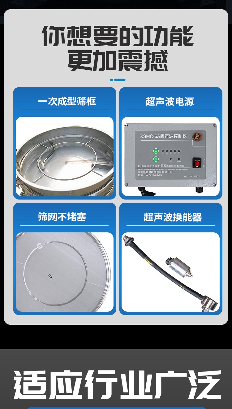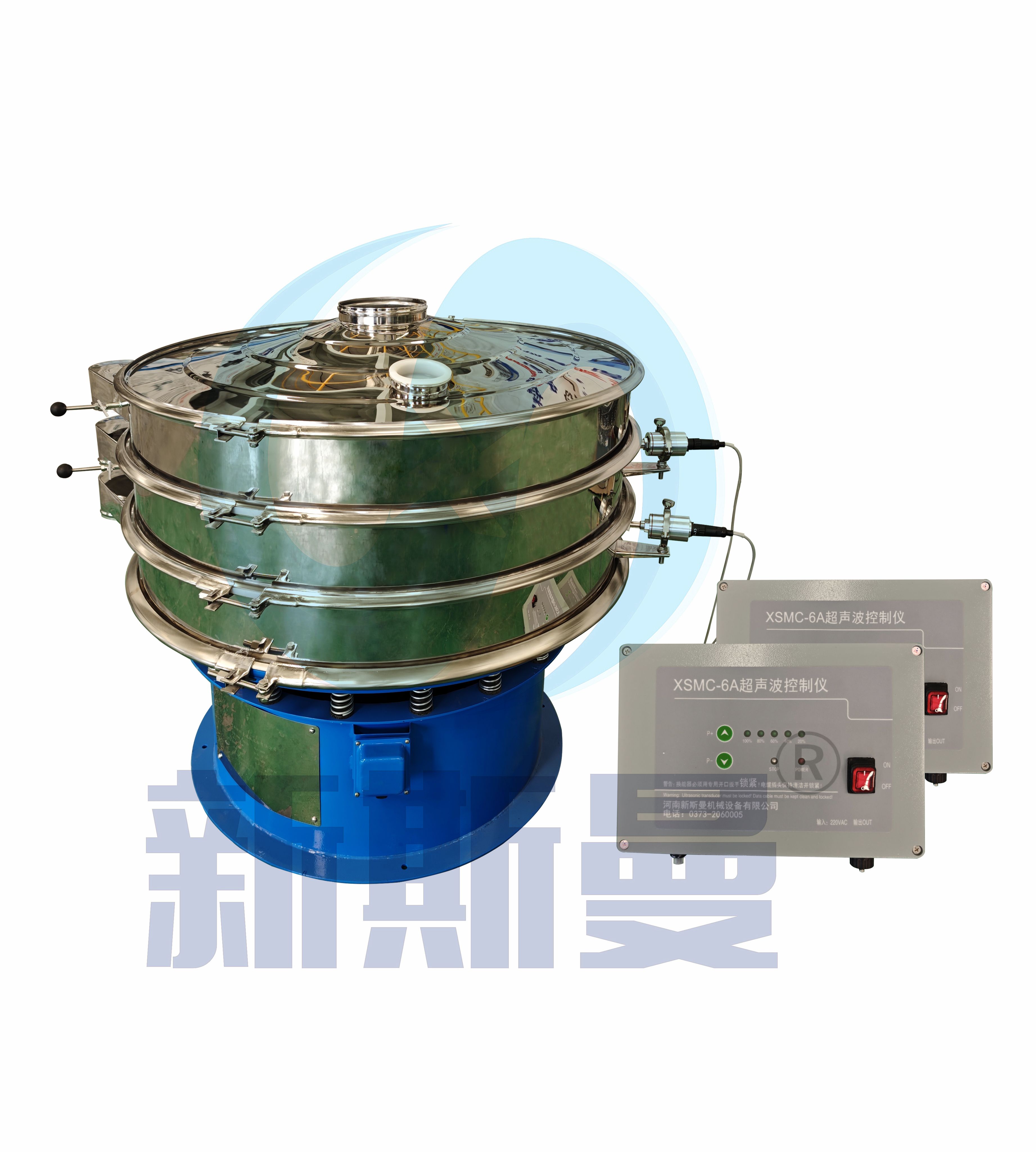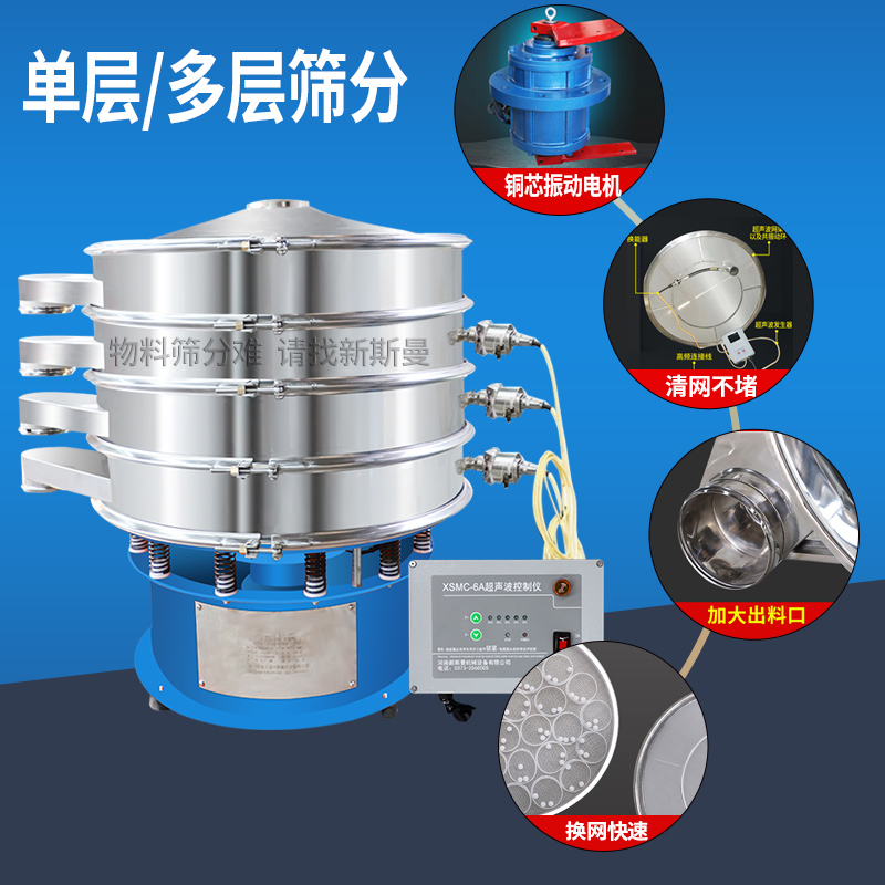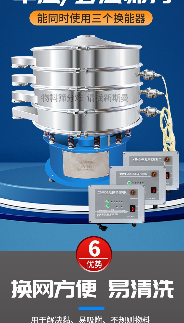 超聲波振動(dòng)篩是將220V、50Hz或110V、60Hz電能轉(zhuǎn)化為36KHz的高頻電能,輸入超聲換能器,將其變成36KHz機(jī)械振動(dòng),產(chǎn)生的功率超聲波使篩網(wǎng)作高頻振動(dòng)。篩網(wǎng)上的物料在作低頻旋振運(yùn)動(dòng)的同時(shí),疊加上超聲振動(dòng),既可防止網(wǎng)孔堵塞,又可使篩分機(jī)提高產(chǎn)量和質(zhì)量,從而達(dá)到快速篩分和清網(wǎng)的目的,使超微細(xì)粉篩分成為易事。該系統(tǒng)在傳統(tǒng)的振動(dòng)篩基礎(chǔ)上在篩網(wǎng)上引入一個(gè)低振幅、高頻率的超聲振動(dòng)波(機(jī)械波),以改變超微細(xì)分體的篩分性能。新斯曼系列超聲波旋振篩是在旋振篩基礎(chǔ)上加裝了一套超聲波篩分系統(tǒng),能有效解決物料:強(qiáng)吸附性、易團(tuán)聚、高靜電、高精細(xì)、高密度、輕比重等篩分難題,具有優(yōu)越的性能!篩分精度比普通旋振篩可提高1—70%,產(chǎn)量可提高0.5-10倍。干粉粒度可分級(jí)到25μm(600目)。特別適合高附加值精細(xì)分體的用戶使用。